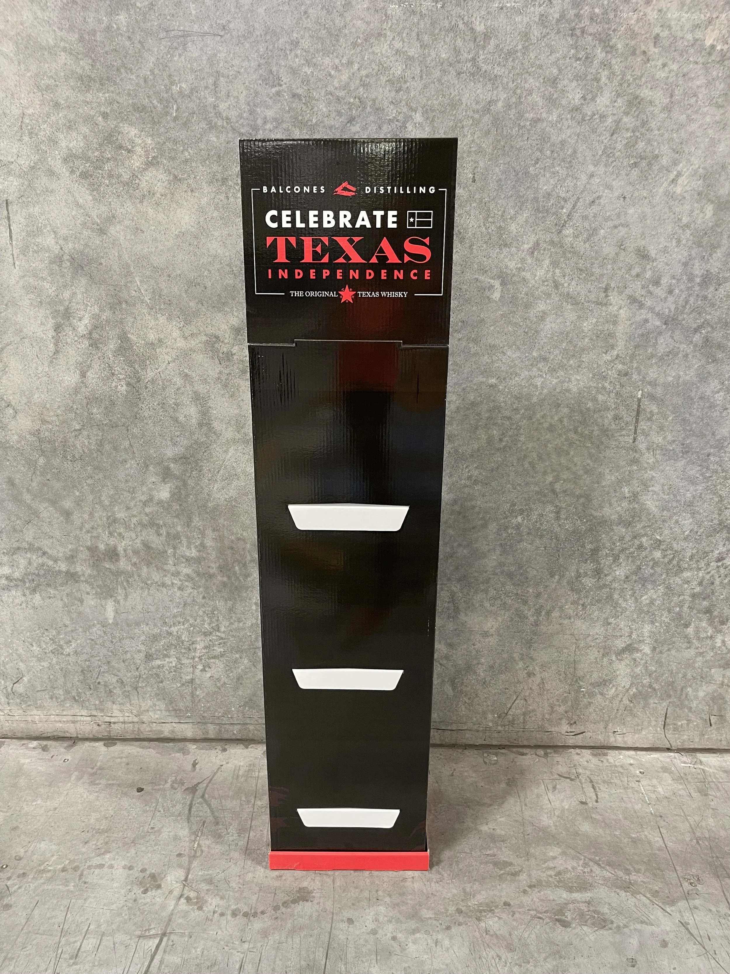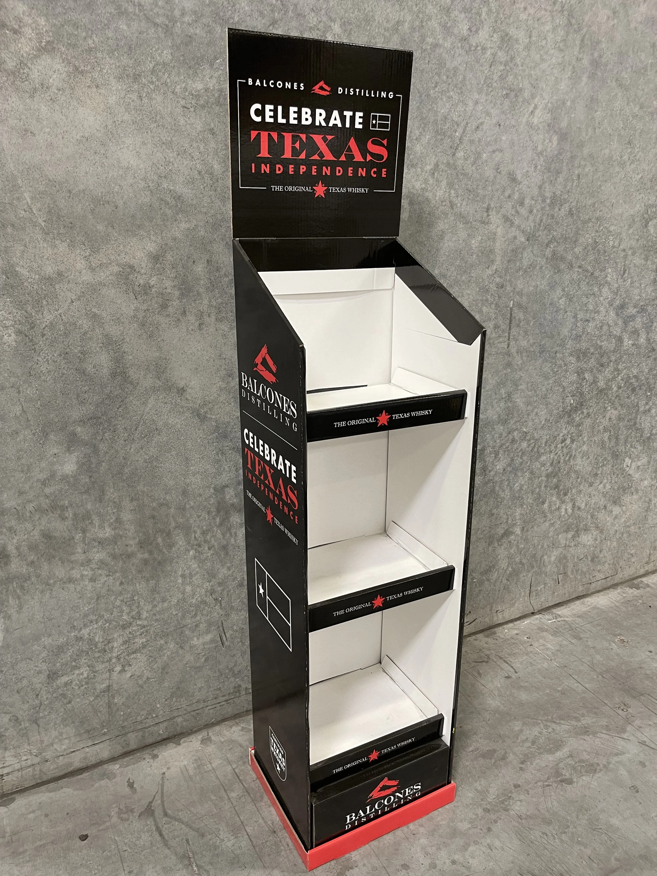 Our client selected from our stock display program for this project, choosing one of our most popular designs. These three-shelf displays are an expensive merchandiser for beer, wine and spirits brands. Also known as shippers or bin displays, they are designed to hold up to 50lbs per shelf and, in this case, held three cases of the 750ml Balcones whiskey bottles. They assemble in minutes and are made from recycled content and are 100% recyclable.