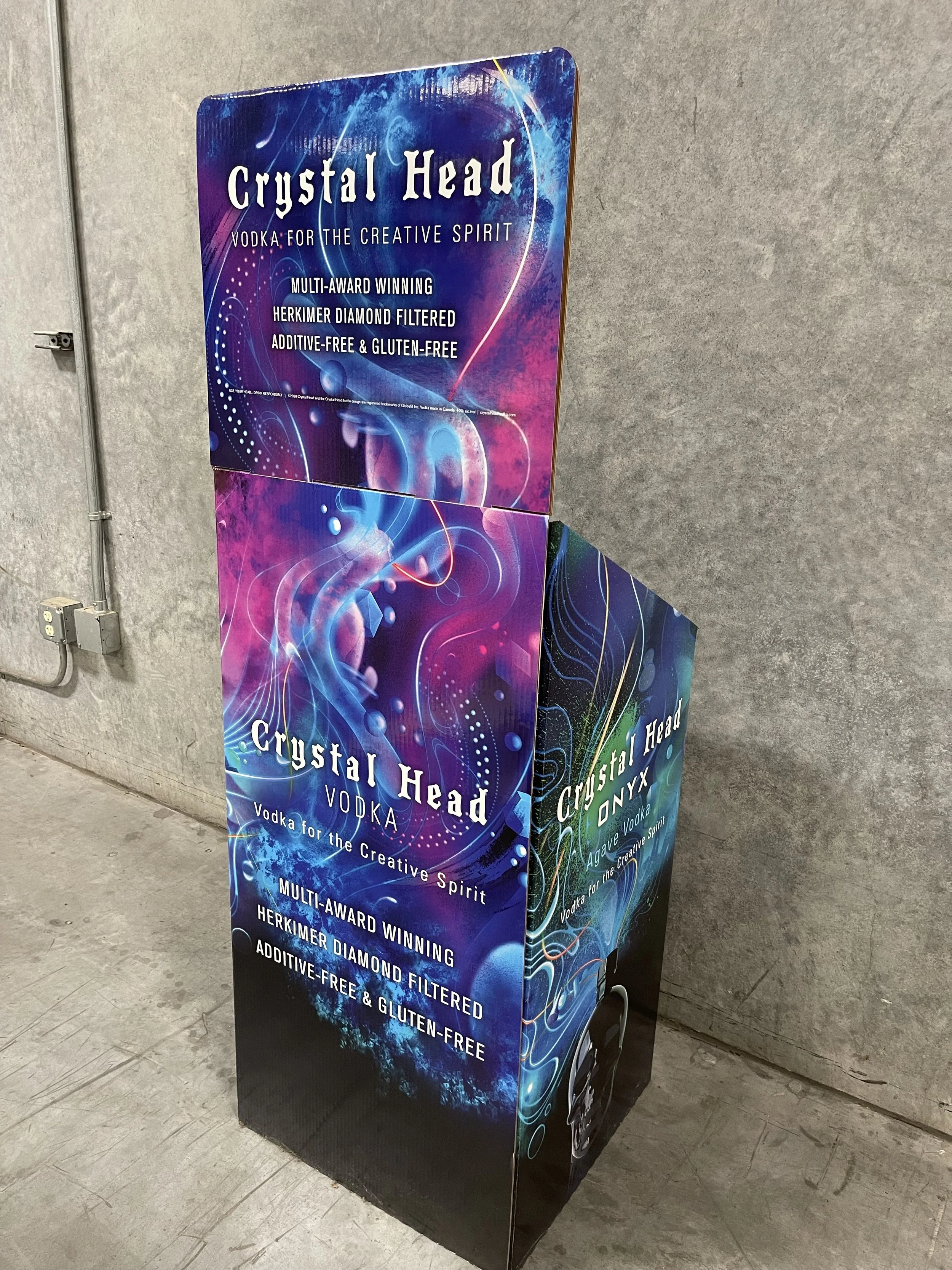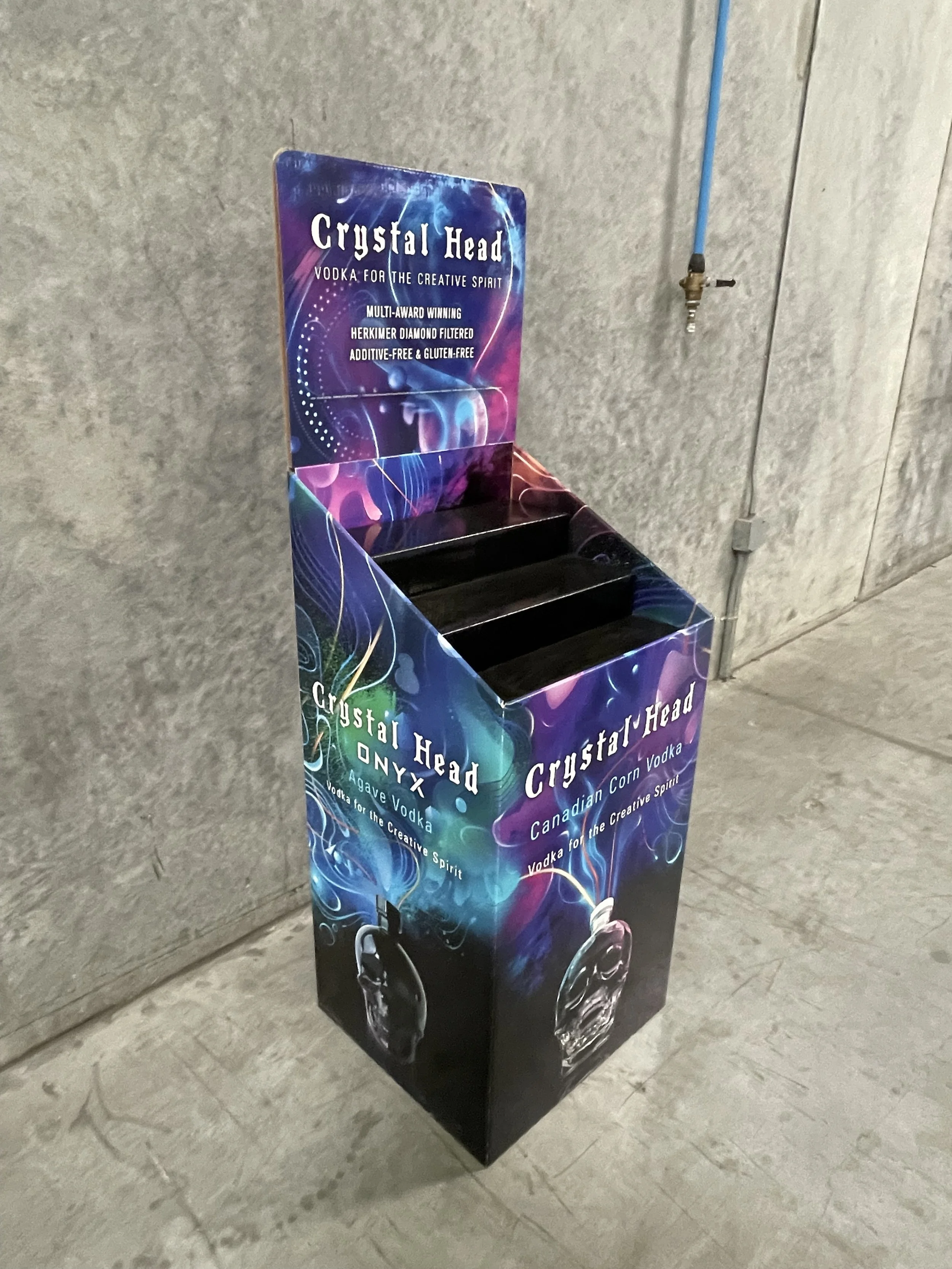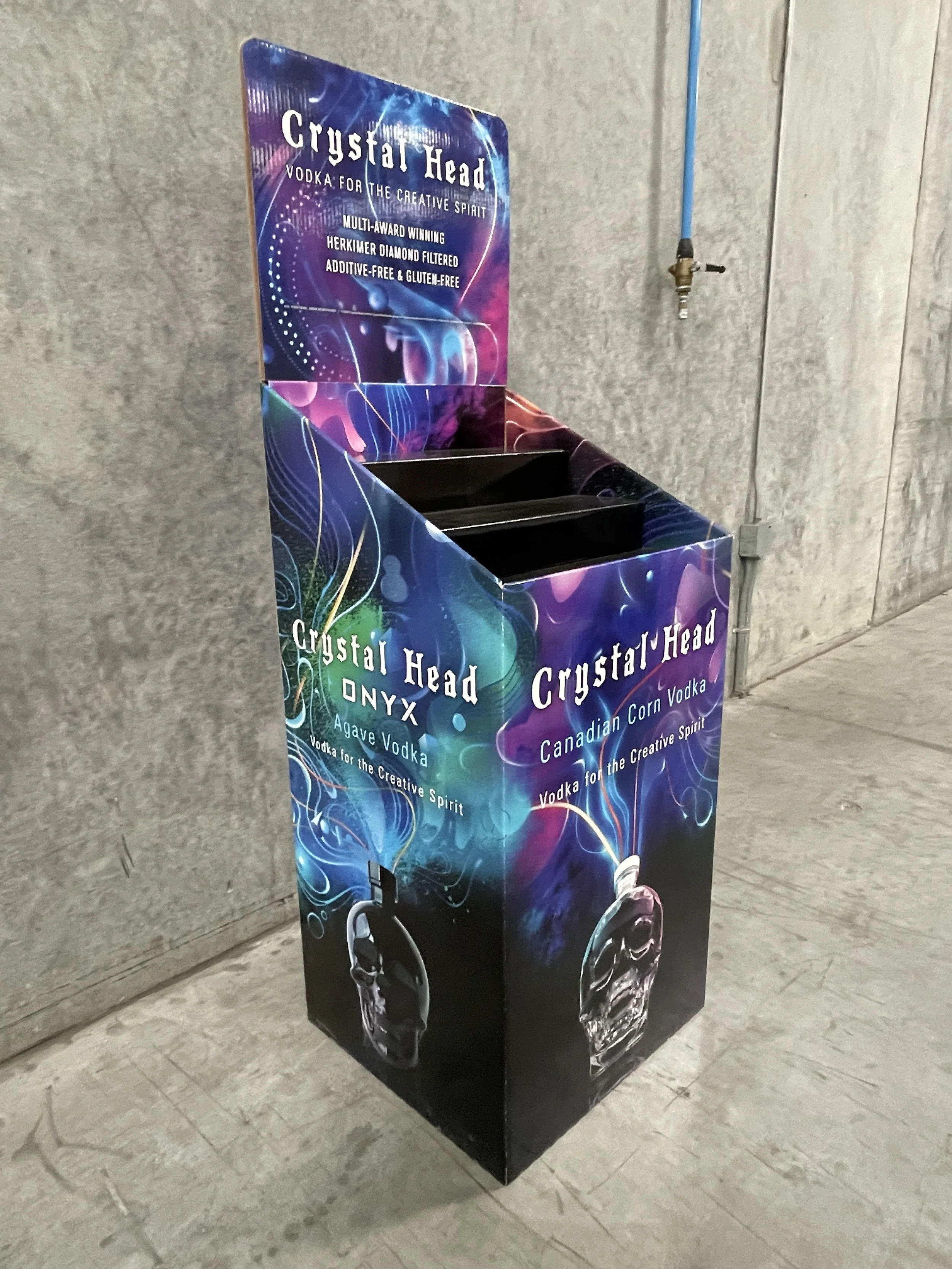 This standard 750ml bottle case riser was enhanced with shelf tiers to give better visibility to CHV’s awesome looking 750ml skull-shaped bottles. Our high gloss digital printing further enhanced the stunning artwork and was a huge success in store.