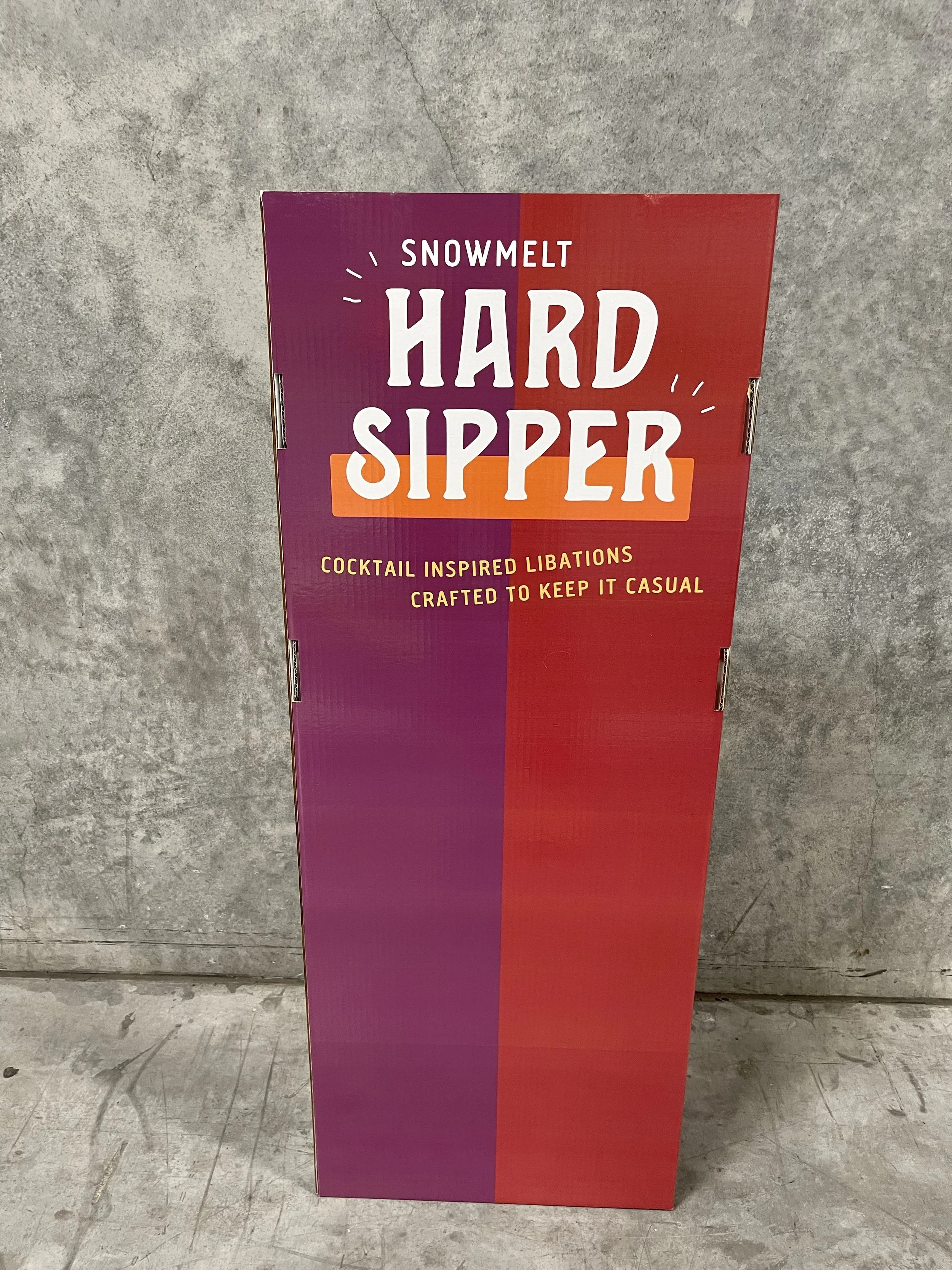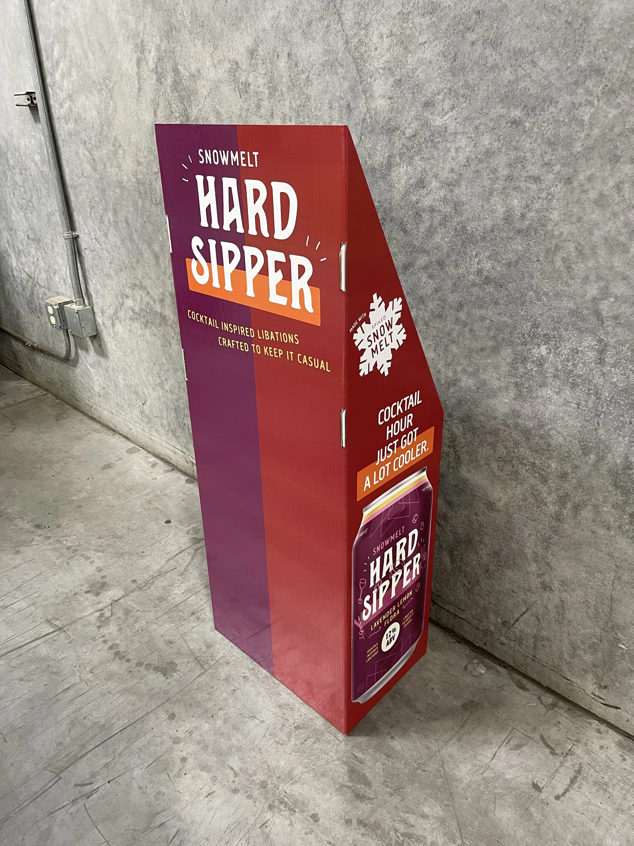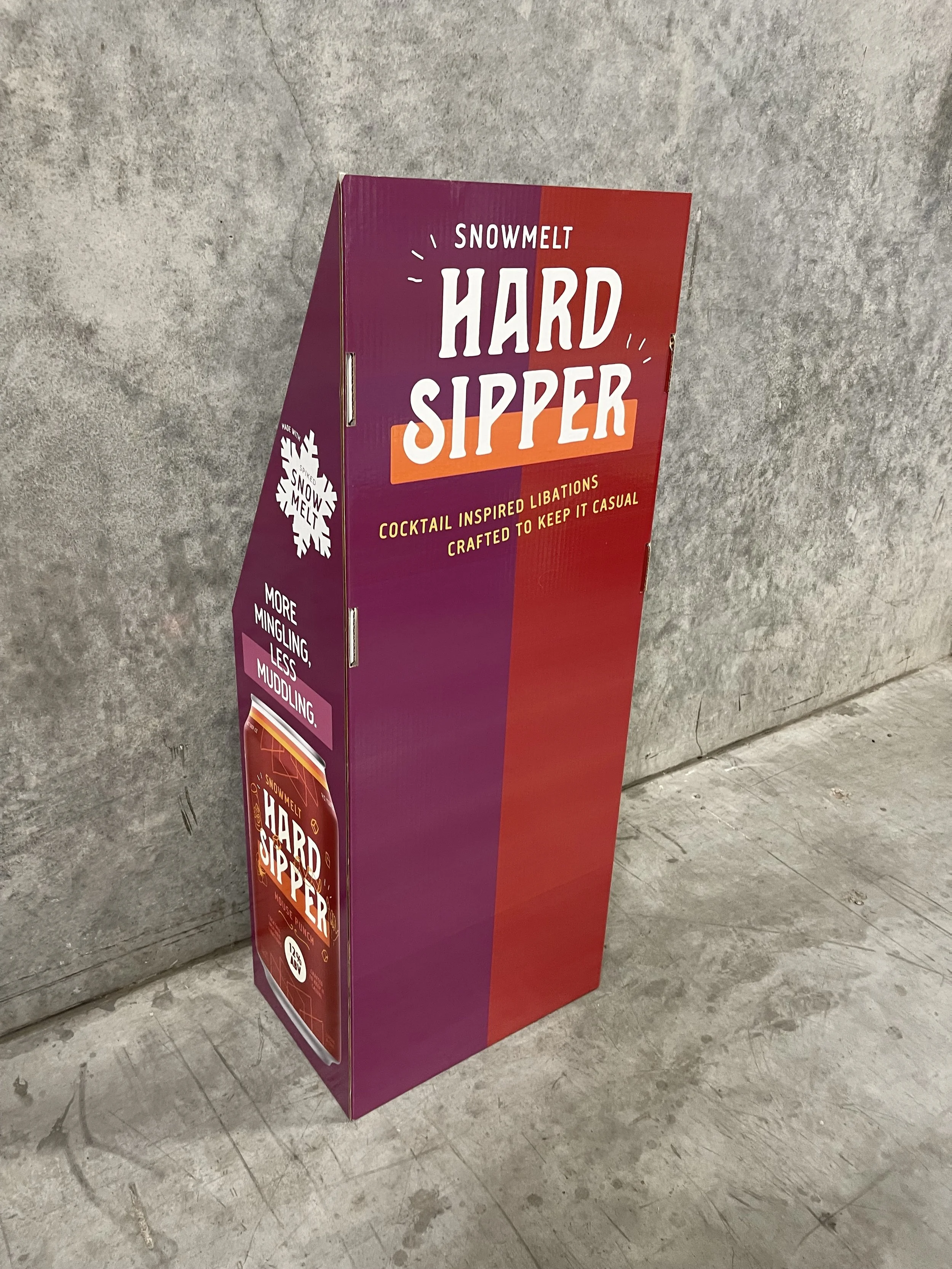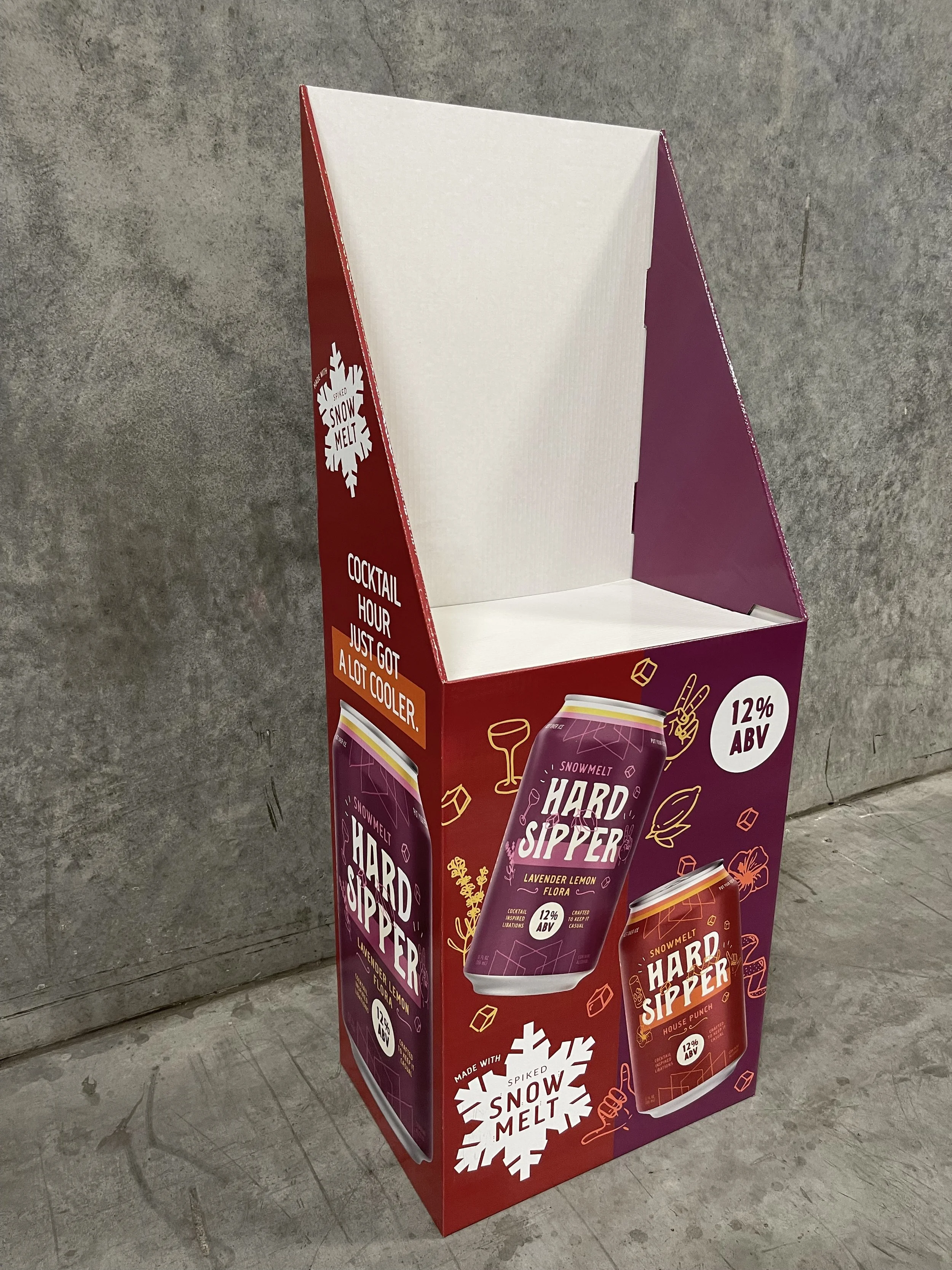A unique twist on our standard case riser display with angled sides and a built in header. Our client challenged our design team with this direction and we came through with an attractive case bin that would safely hold stacks of cases at a convenient height for easy shopping.