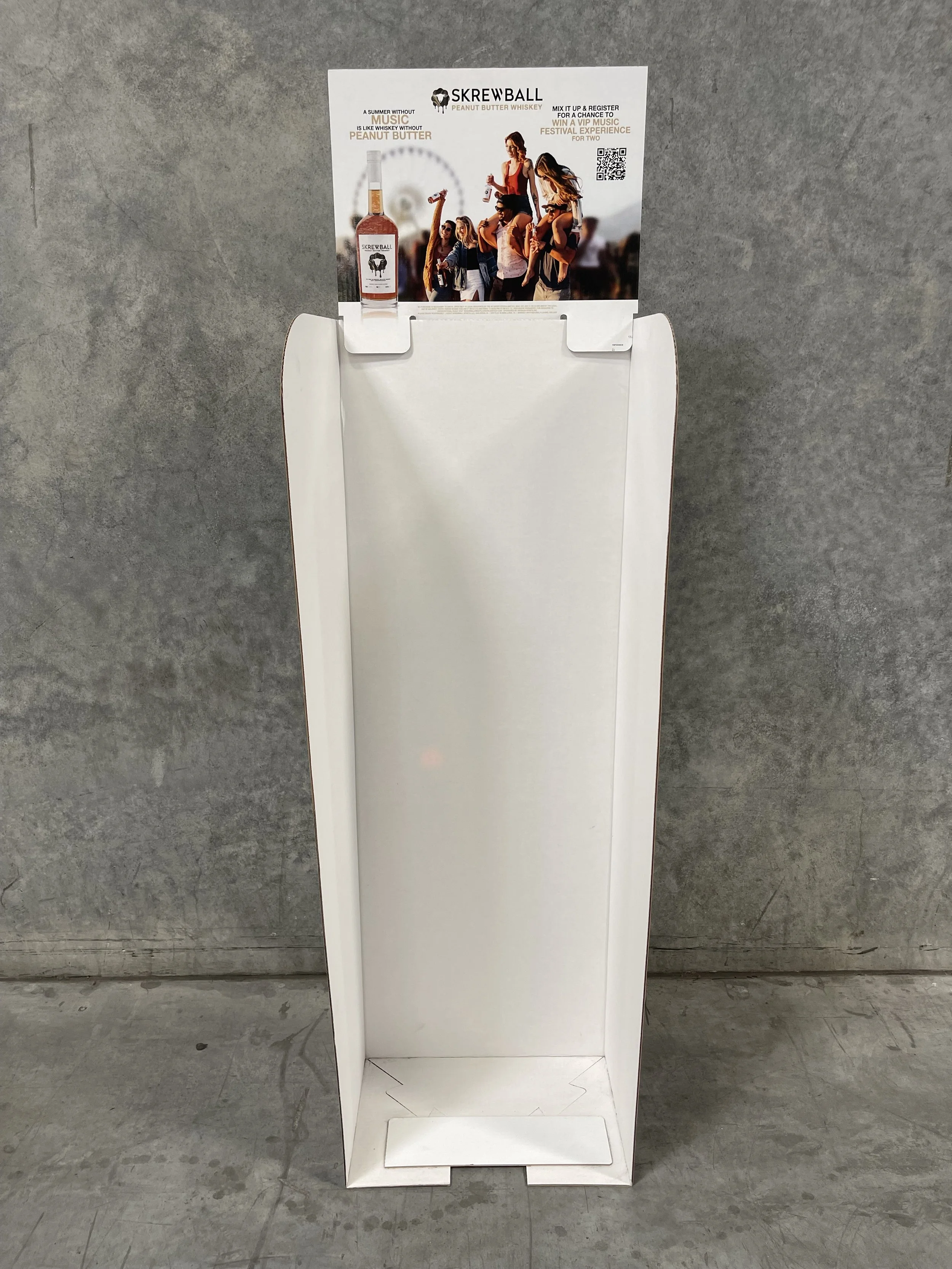 One of our stock display products, this case stacker display was designed for versatility and shopability. Cases stack fron the ground up and are shrouded with our clients' artwork on the sides and back and is topped off with an interchangeable 2-sided header.